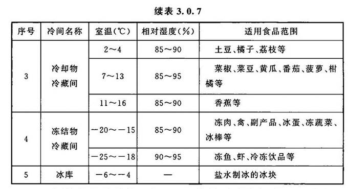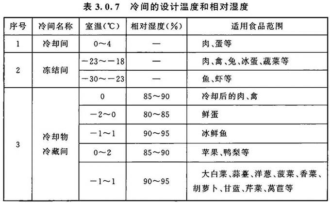3.0.7 冷间的设计温度和相对湿度应根据各类食品的冷藏工艺要求确定,也可按表3.0.7的规定选用。温度波动范围应根据各类食品的冷藏工艺要求确定;当冷藏工艺没有明确要求时,冷却物冷藏间温度波动范围不宜超过±1℃,冻结物冷藏间温度波动范围不宜超过±1.5℃。