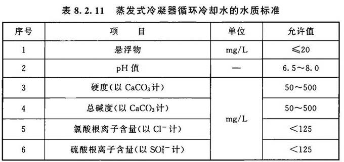 8.2.11 蒸发式冷凝器循环冷却水运行水质标准是指导循环冷却水运行的一个重要指标。水质标准数据是根据有关蒸发式冷凝器设备要求及相关工程实例结果提出的,不同产品的蒸发式冷凝器有不同要求,本条提出的水质标准应为基本条件,有特殊要求的设备,按其产品要求进行控制。
