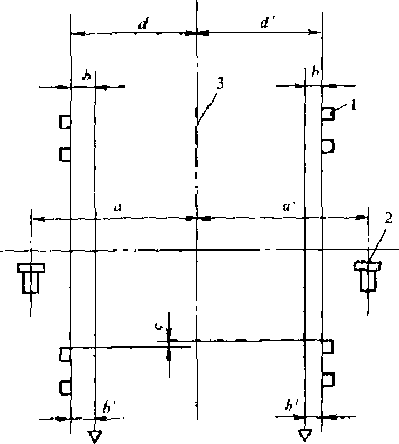 a.托塩底座的纵向、横向中心线极限偏差为士 S 5mιm两 托程底座的横向中心线应平行,其中心距之差储一口‘)不得大 于0.5tum,对角线之差(方一力‘)不得大于Immc