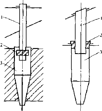 我一有填料式旋风子B-无填料式旋风子 I 一导气管门一导向叶片:3-推形外筒