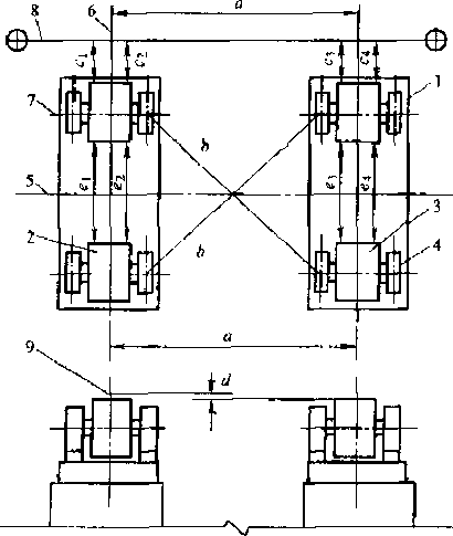 d.对应的两个上托辘的上表面中心点的高低蒙不得大于 0.5mm;对应庾个下托報的上表面中心点的高低差不得大于 0.5InmQ