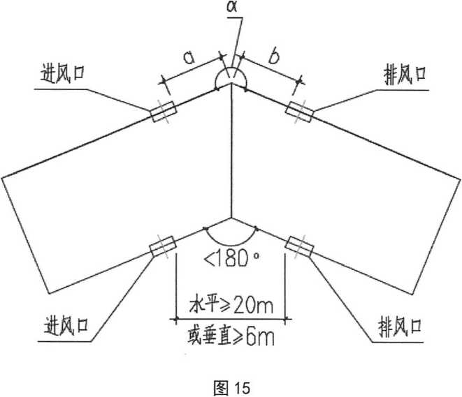 15.第3. 3. 5. 3条,"送风机的进风口不应与排烟风机的出风口设在同一面上。当确有 困难时。。。。。。”,若送风机的进风口与排烟风机的出风口分别在相邻两面(如南 面与东面),其间距如何要求?