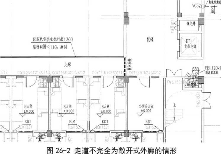 (2)走道不完全为敞开式外廊的情形,需将非敞开部分采用挡烟垂壁等措施隔开, 敞开式外廊部分可按(1)的理解不划分防烟分区。如下图: