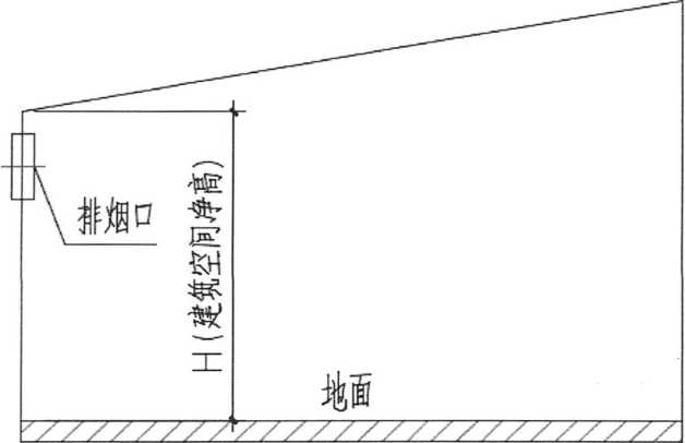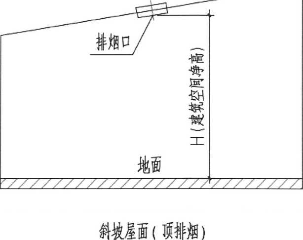 (1)对于斜坡屋面或顶棚(包含人字形屋顶),当排烟窗(口)设置于斜坡屋面 或顶棚时,建筑空间净高为排烟窗(口)中心距地面的高度(如图35-1所示);当排 烟窗(口)设置于侧墙时,建筑空间净高为檐口(或顶棚)最低点距地面的高度(如图 35-2所示)。