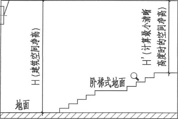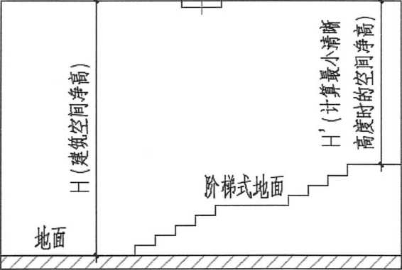 (2)对于平顶顶棚、阶梯式地面的场所,用于计算排烟量等(第4. 6. 3条)的建 筑空间净高H为平顶顶棚到阶梯式地面的最低地面的高度;用于确定最小清晰高度的 室内净高田 为平顶顶棚到阶梯式地面的最高地面的高度(如图35-3、35-4所示)。