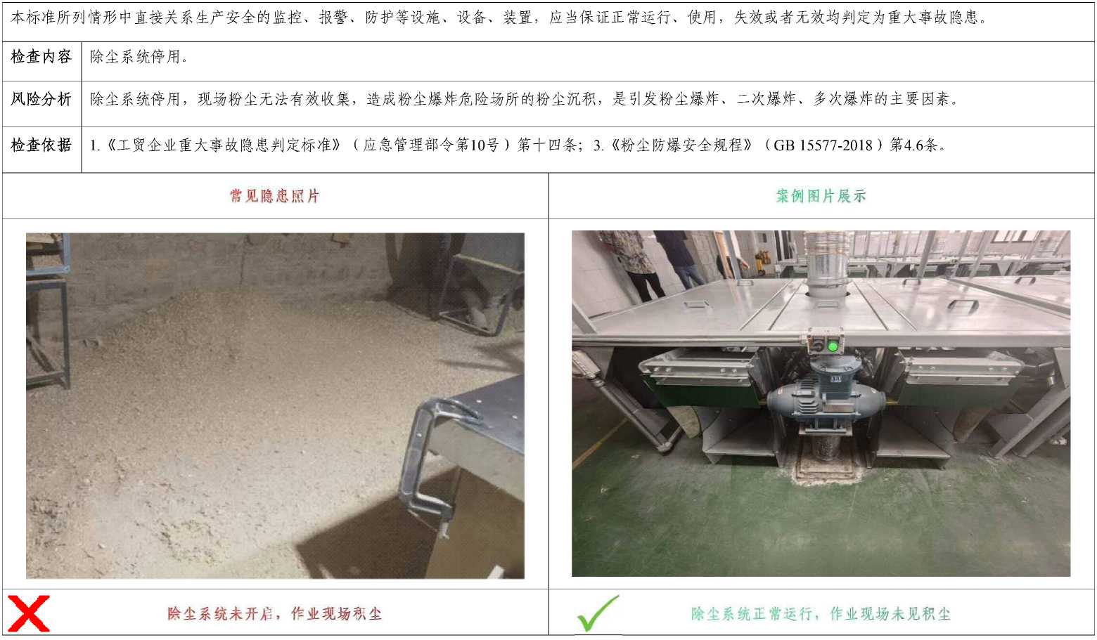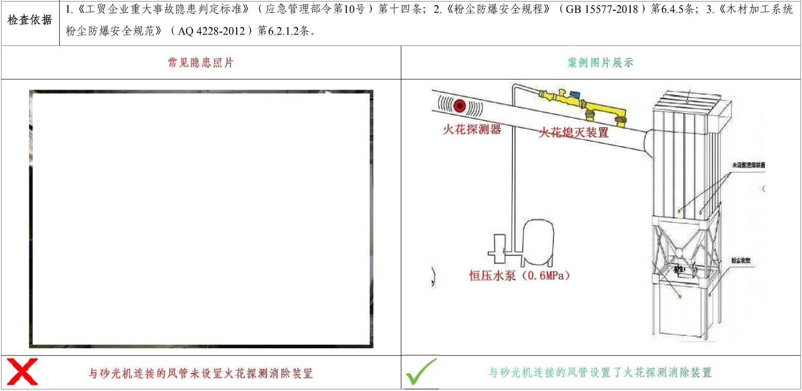 1.《工贸企业粉尘防爆安全规定》(应急管理部令第6号)第十五条;2.《工贸企业重大事故隐患判定标准》(应急管理部令第10号)第十一条第三 检查依据
