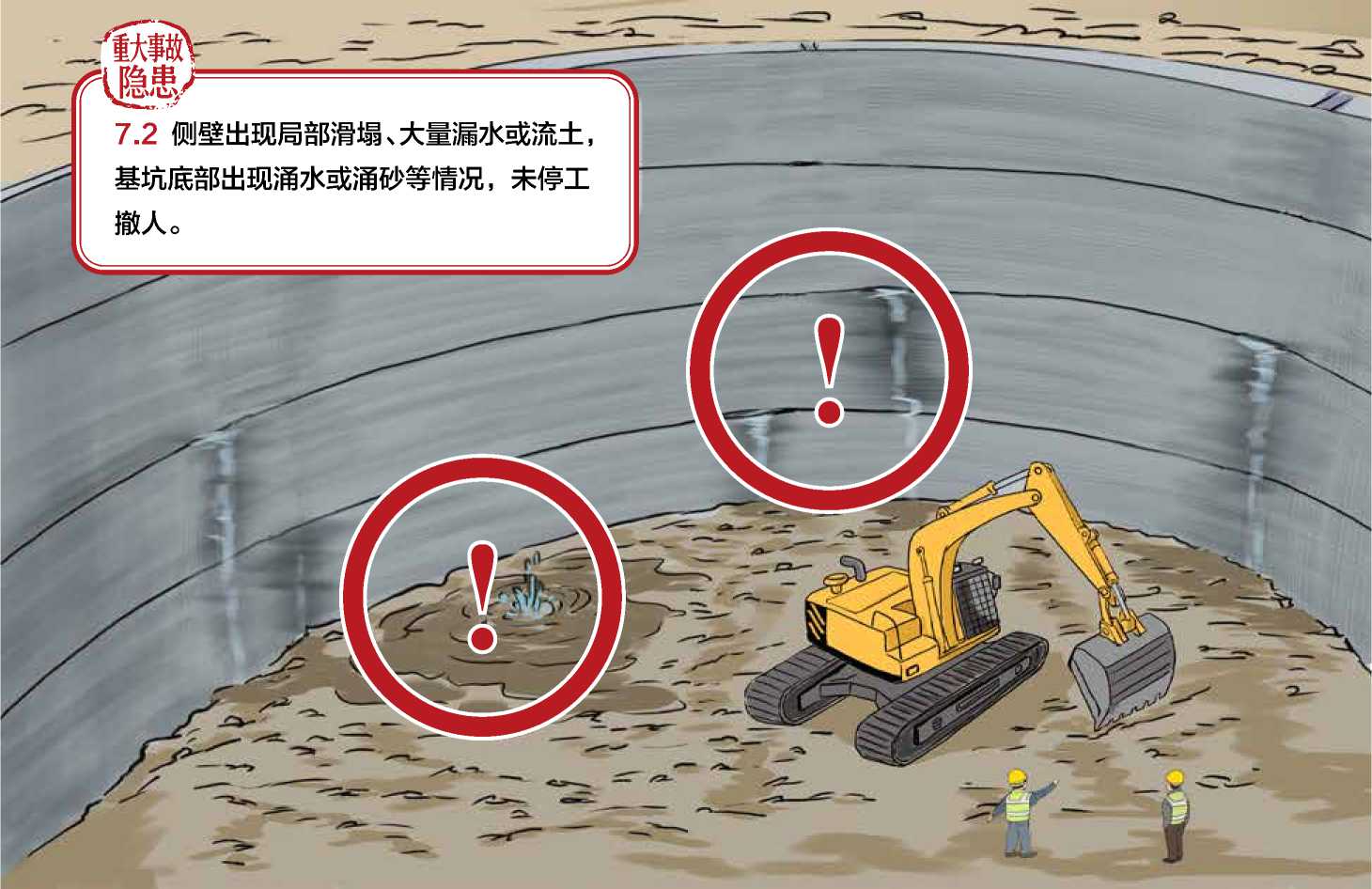 (二)侧壁出现局部滑塌、大量漏水或流土,基坑底部出现 涌水或涌砂等情况,未停工撤人。