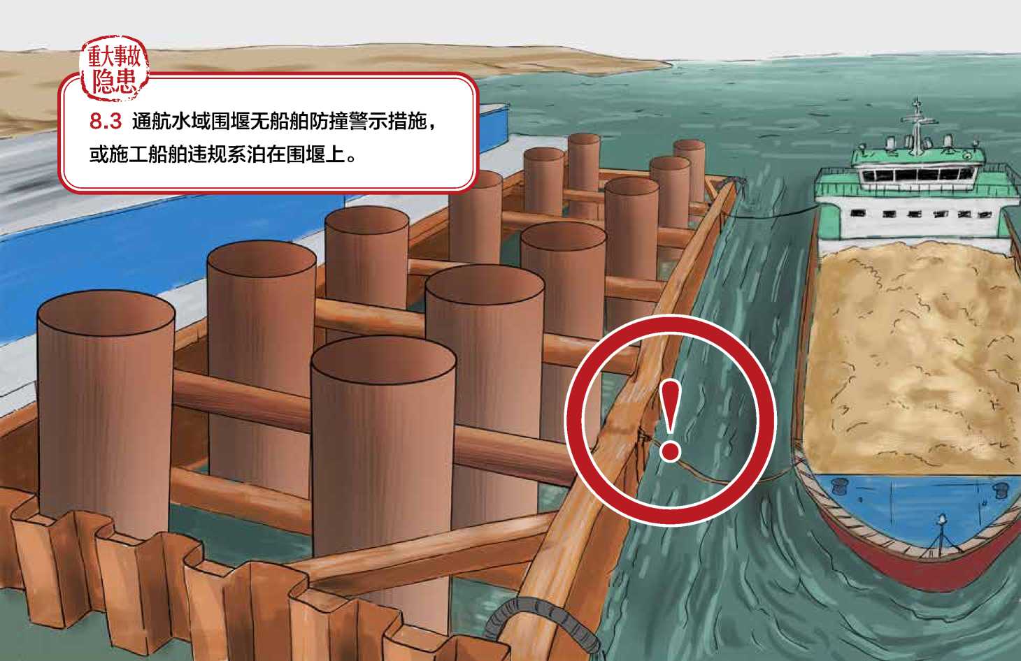 (三)通航水域围堰无船舶防撞警示措施,或施工船舶违规 系泊在围堰上。