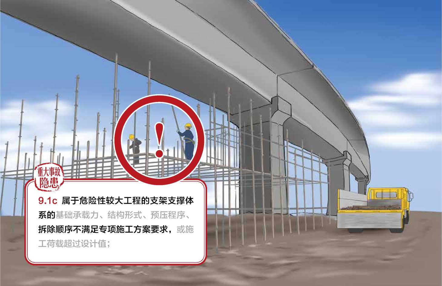 9.1b 属于危险性较大工程的支架支撑体 系的基础承载力、结构形式、预压程序、 拆除顺序不满足专项施工方案要求,或施 工荷载超过设计值;
