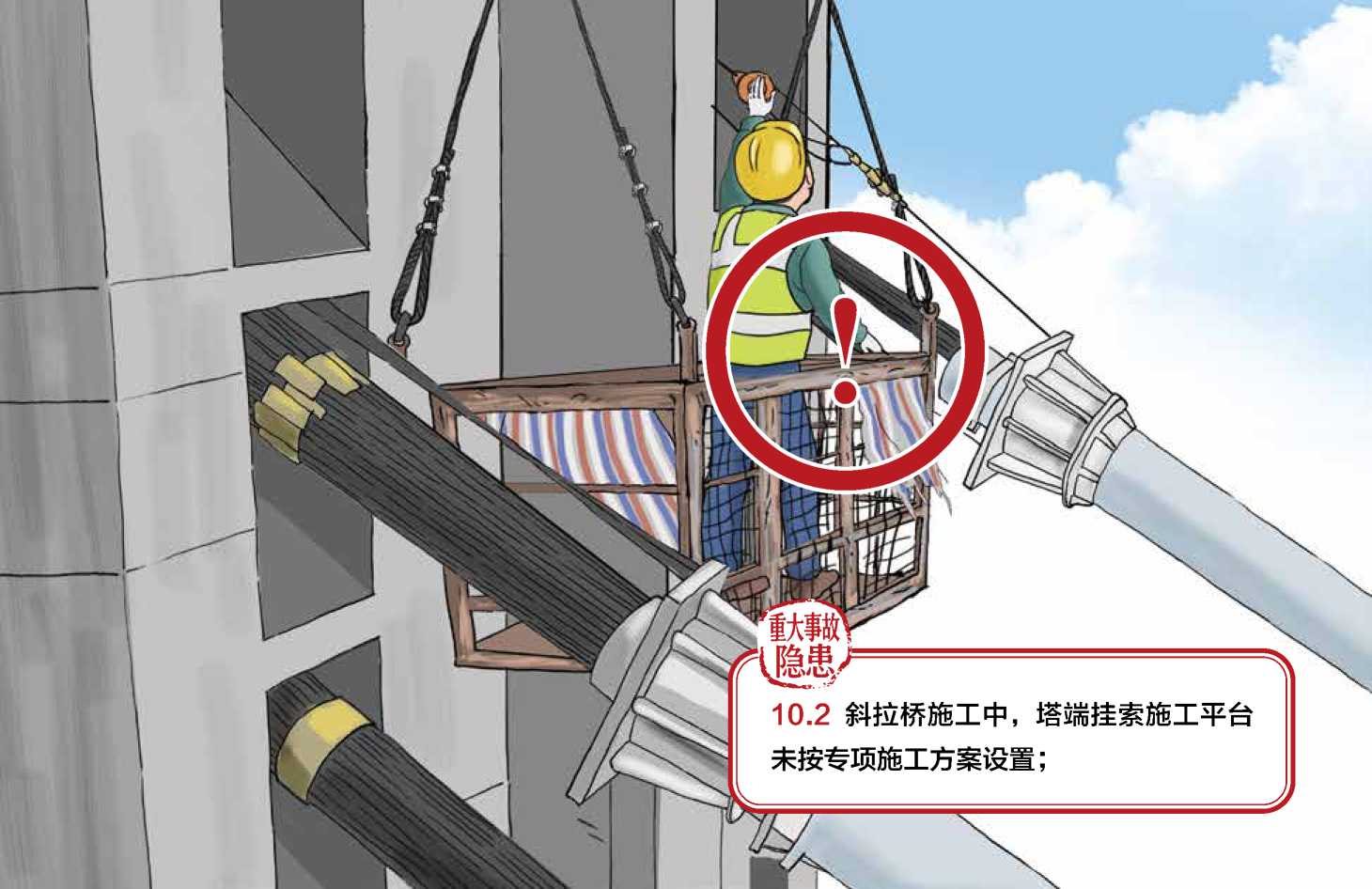 10.3 悬索桥施工中,猫道未按专项施工 方案要求架设或拆除,或未采取抗风稳定 措施,或猫道使用的承重索及其他钢丝绳 投入使用前未经验收合格;