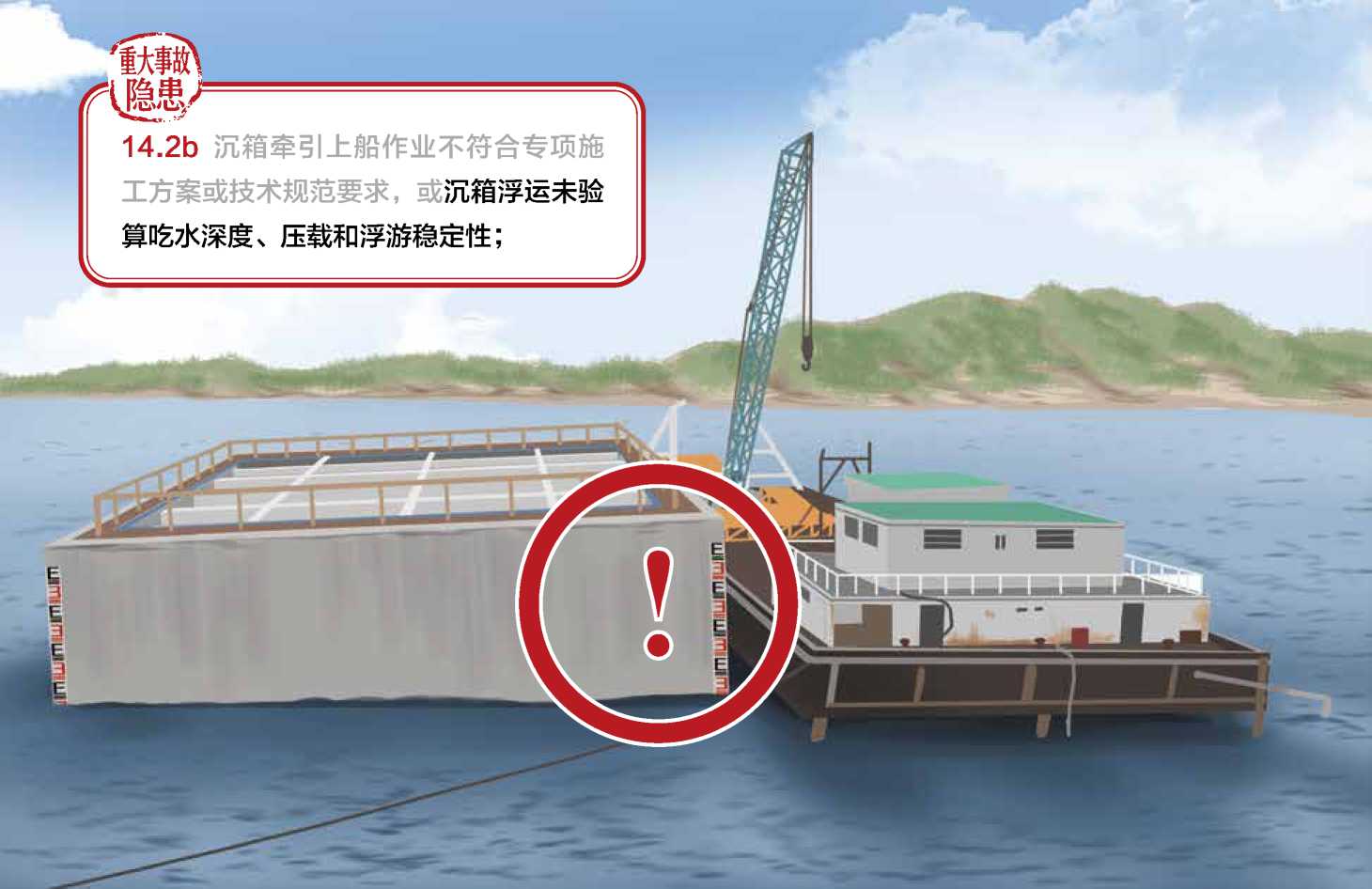 14.2a 沉箱牵引上船作业不符合专项施 工方案或技术规范要求,或沉箱浮运未验 算吃水深度、压载和浮游稳定性;
